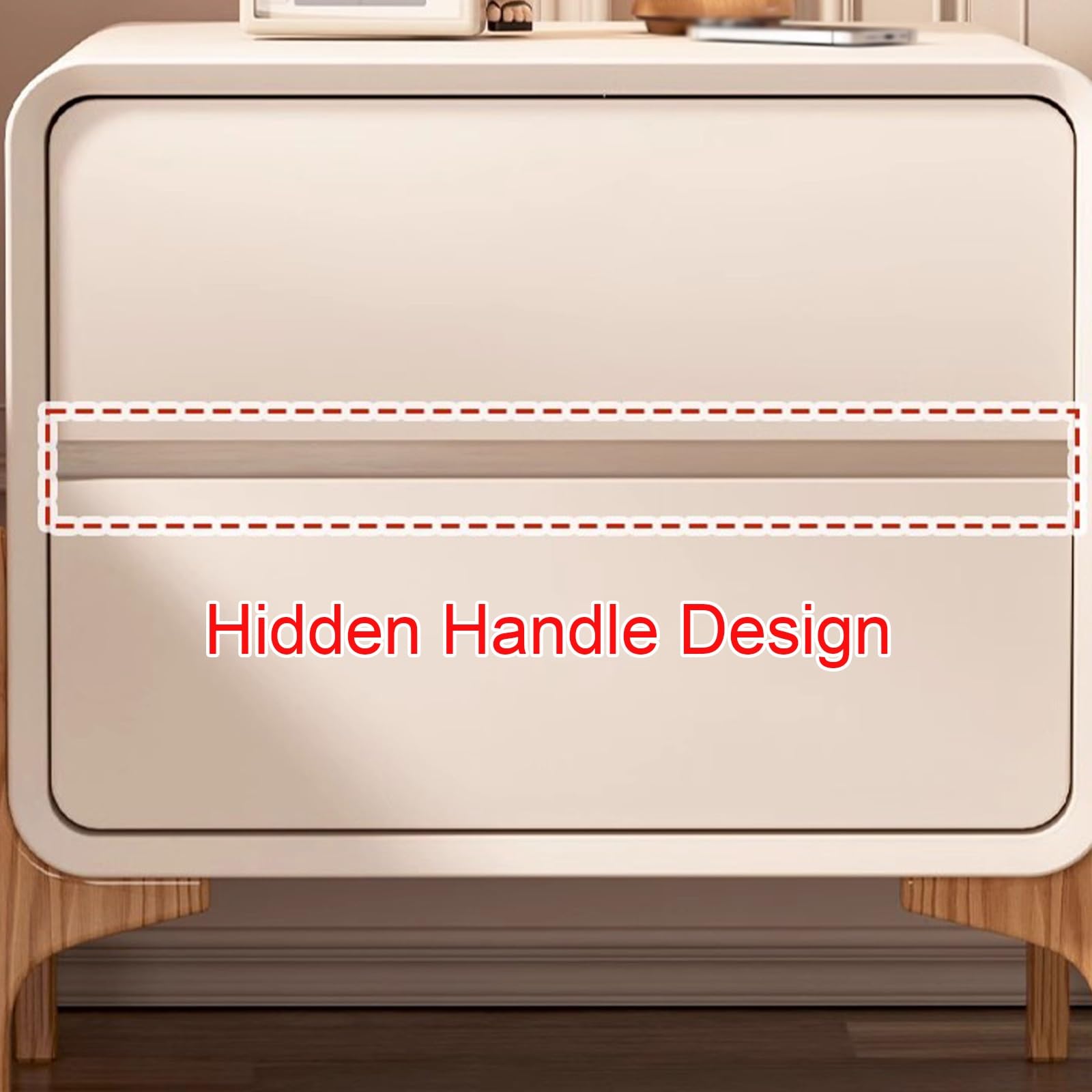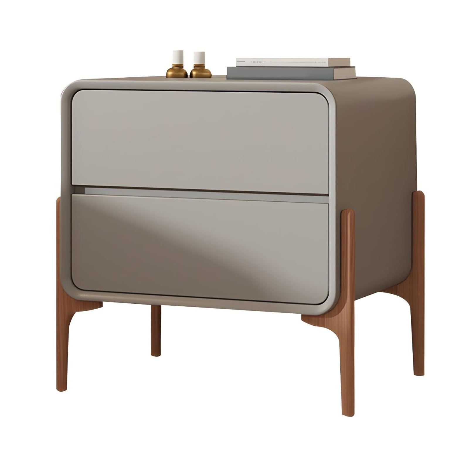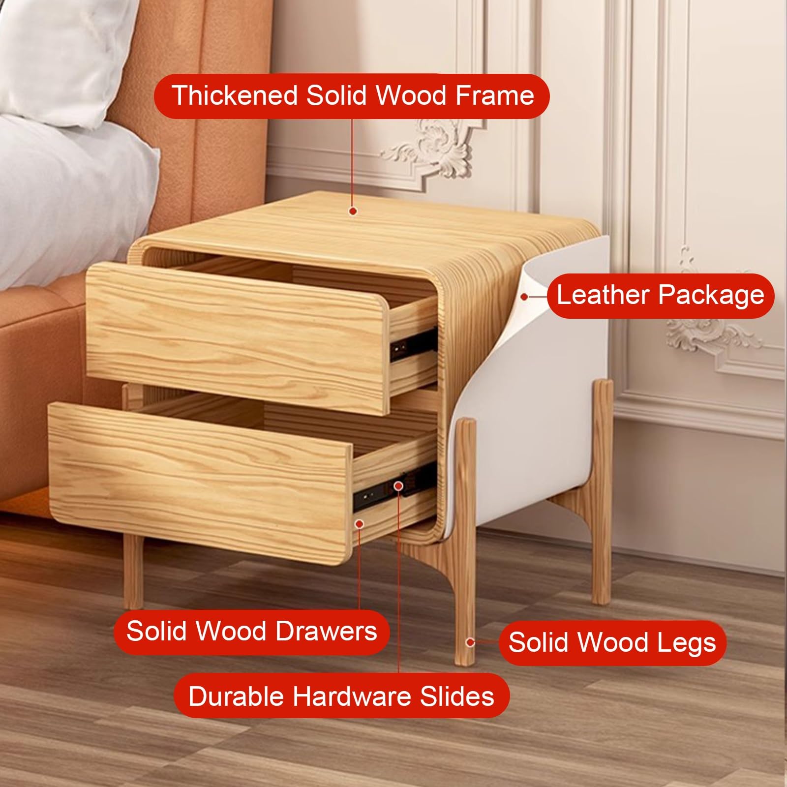 Dispone de 2 cajones espaciosos y una superficie superior abierta, ideal para tener a mano tus objetos esenciales como gafas, libros, mandos a distancia o medicamentos. Fabricada con materiales resistentes y piel de microfibra, sus guías de cajón de deslizamiento suave y patas altas sólidas aportan durabilidad, seguridad y facilidad de limpieza.