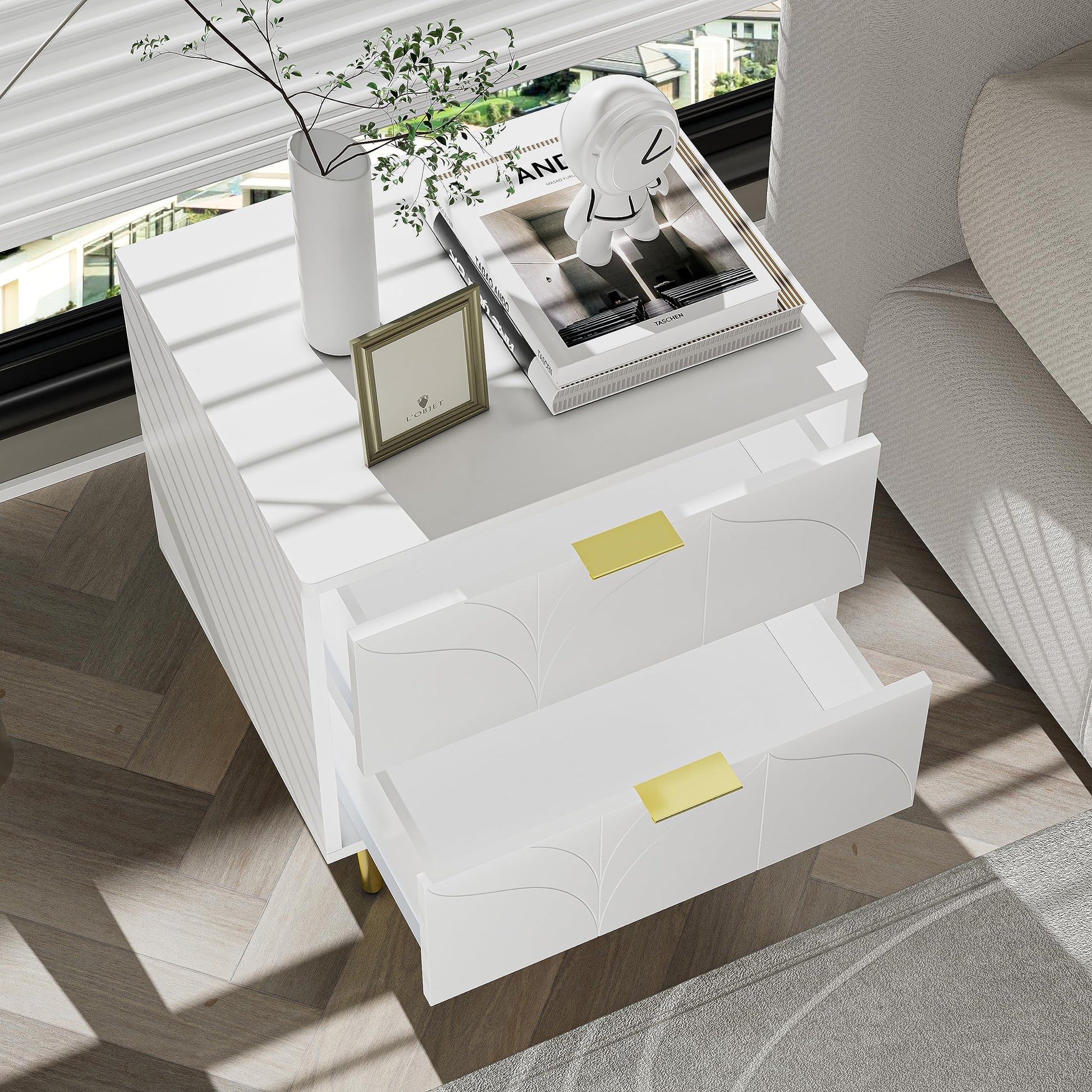 Aporta un toque de elegancia romántica a tu dormitorio con este juego de 2 mesitas de noche blancas con diseño floral de KecDuey. Su estilo moderno con detalles clásicos en acabado lacado y herrajes dorados transforma cualquier espacio en un ambiente sofisticado y acogedor.