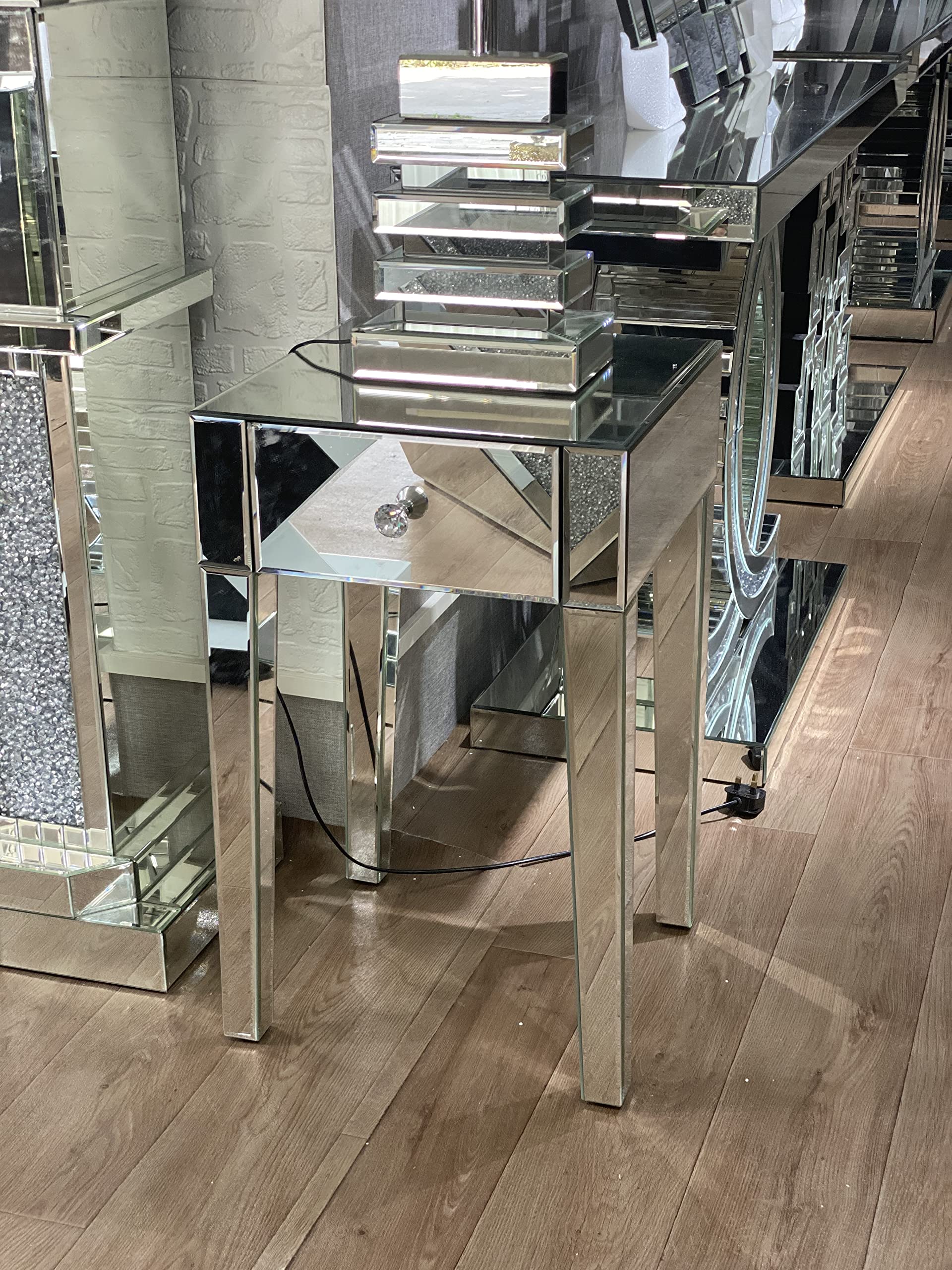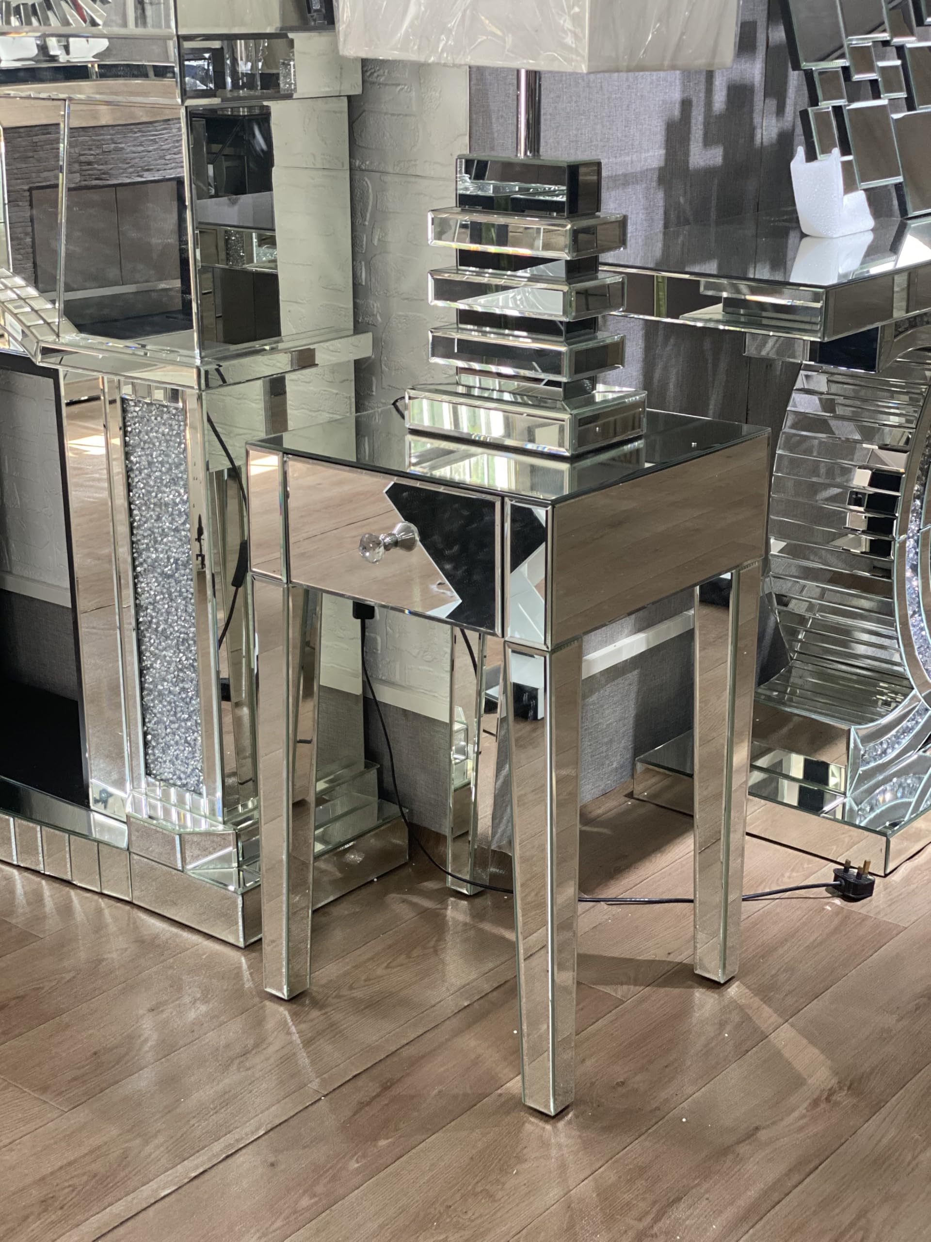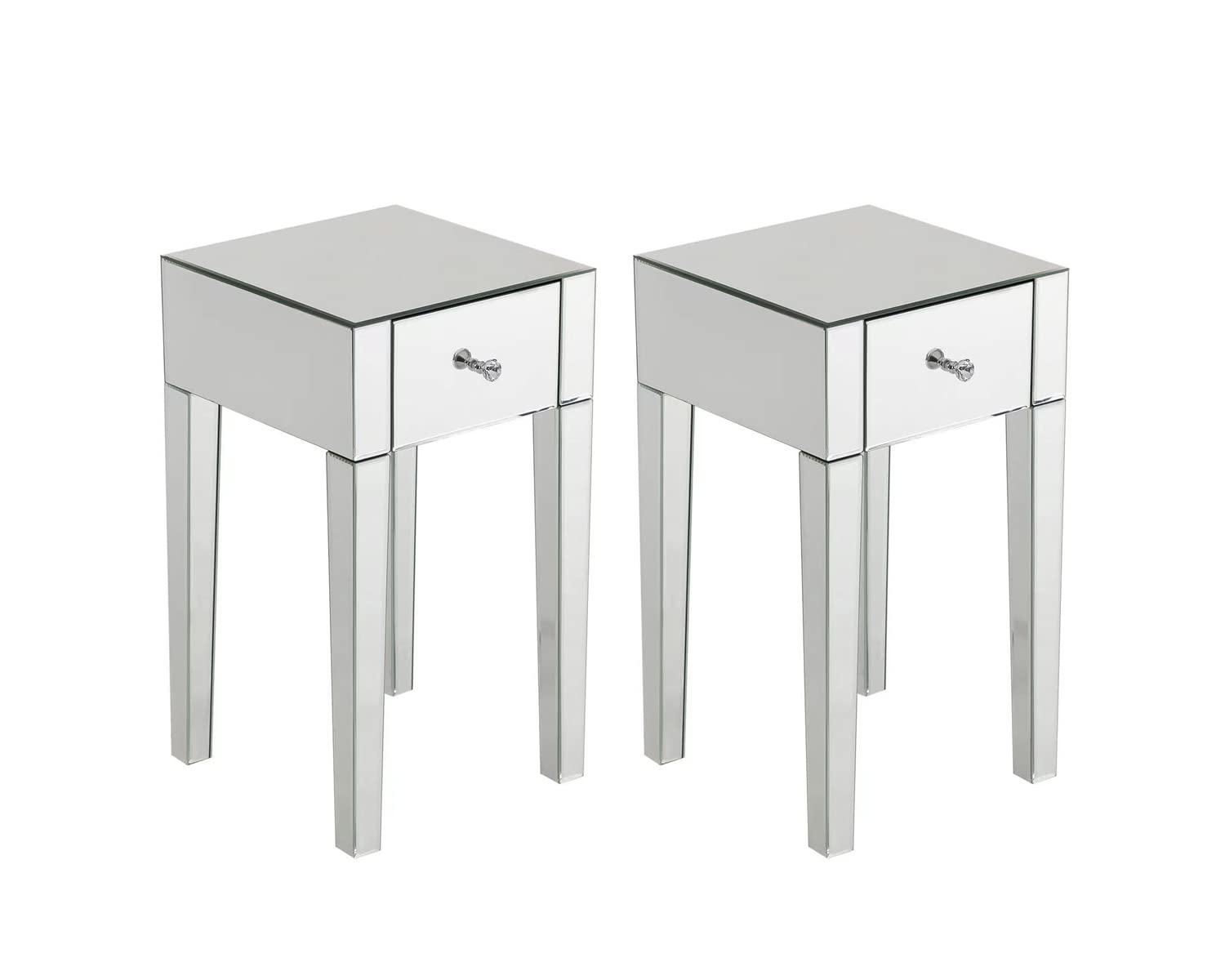 Mesilla de Noche con Espejo de Cristal – 1 Cajón – Set de 2 – 40x40x65 cm – Diseño Elegante para Dormitorio o Salón