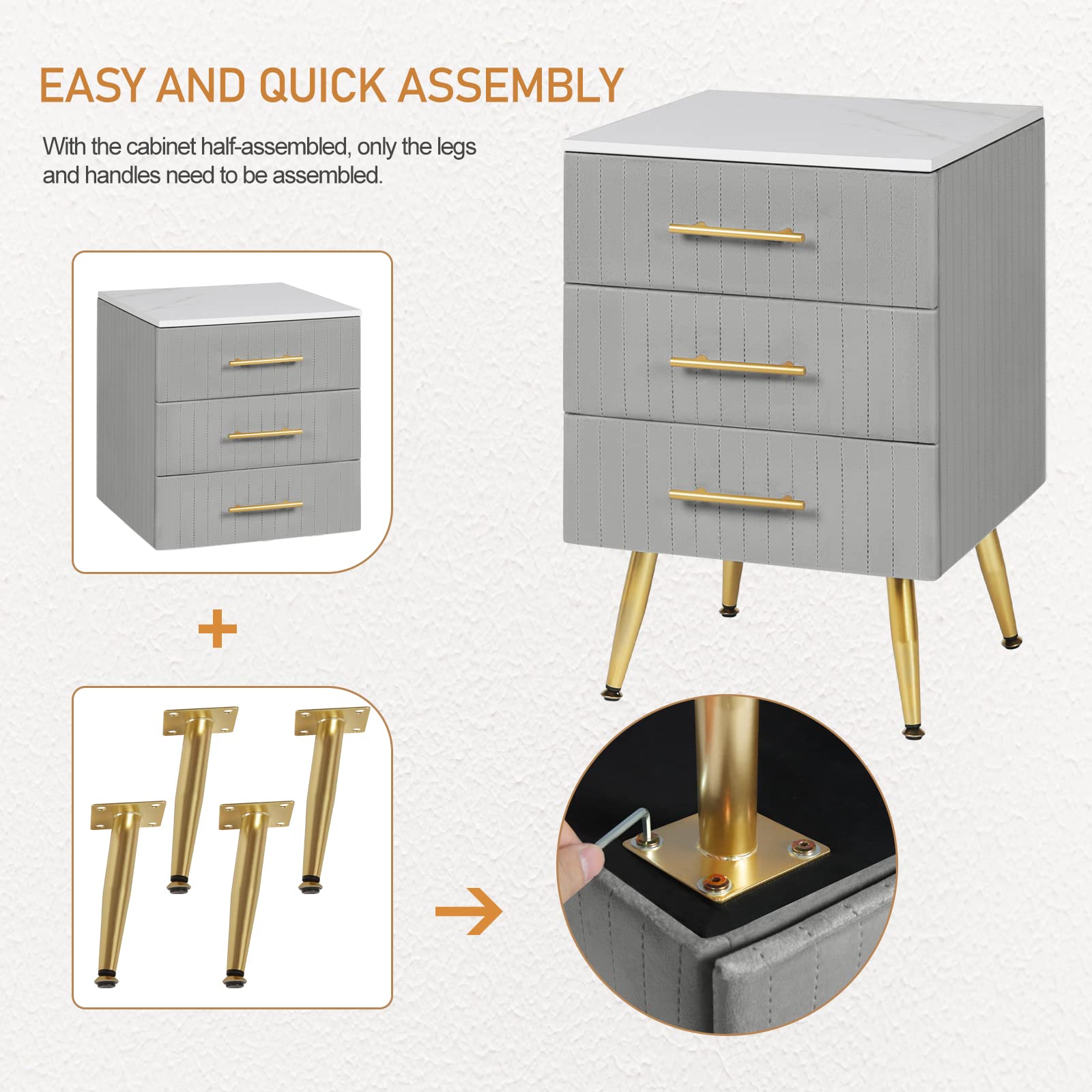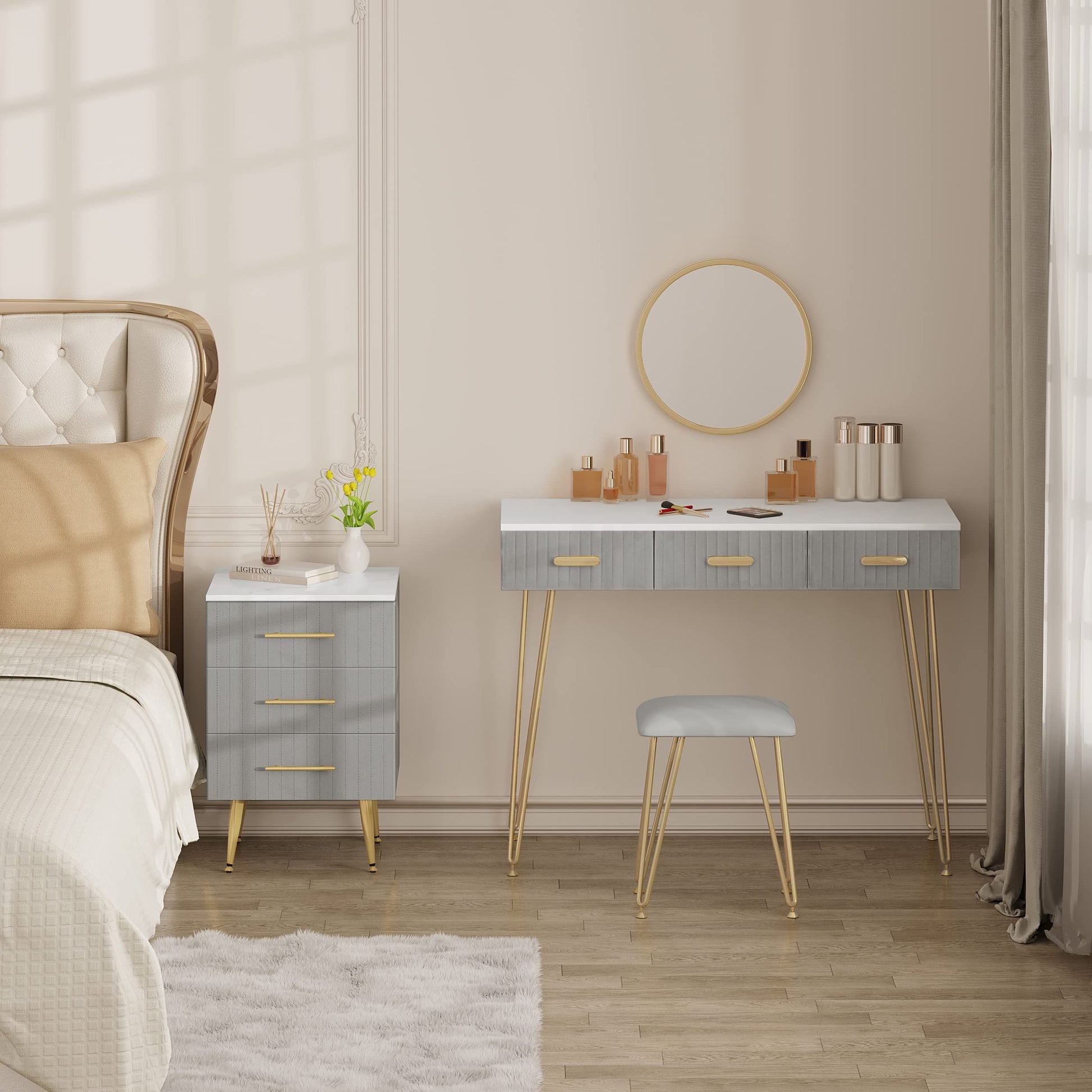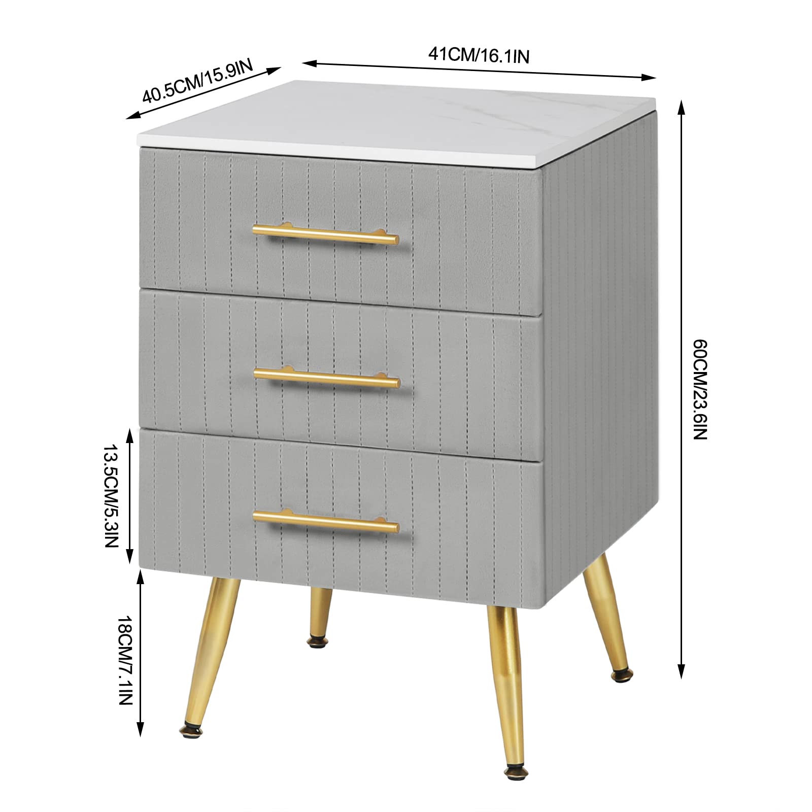 Mesita de Noche WOLTU con 3 Cajones – Set de 2 – Gris Terciopelo y Blanco – 40,5x41x60 cm
