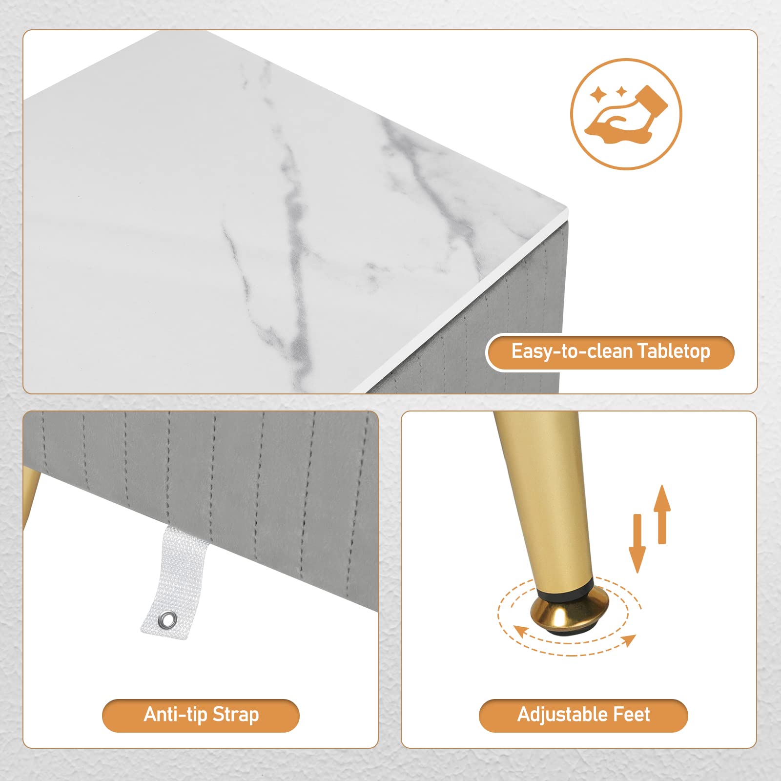 El acabado en terciopelo gris con encimera jaspeada blanca aporta un aire sofisticado y moderno, ideal no solo para dormitorios, sino también para salones, entradas o despachos. Gracias a sus patas metálicas elevadas, la limpieza es más cómoda y el mueble gana en estabilidad y resistencia.